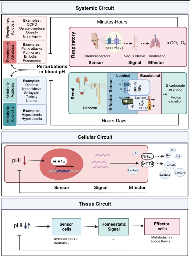 pH is tightly maintained at cellular, tissue, and systemic levels, and altered pH – particularly in the acidic range – is associated with infection, injury, solid tumors, and physiological and pathological inflammation. However, how pH is sensed and regulated and how it influences immune responses remain poorly understood at the tissue level. Applying conceptual frameworks of homeostatic and inflammatory circuitries, we categorize cellular and tissue components engaged in pH regulation, drawing parallels from established cases in physiology. By expressing various intracellular (pHi) and extracellular pH (pHe)-sensing receptors, the immune system may integrate information on tissue and cellular states into the regulation of homeostatic and inflammatory programs. We introduce the novel concept of resistance and adaptation responses to rationalize pH-dependent immunomodulation intertwined with homeostatic equilibrium and inflammatory control. We discuss emerging challenges and opportunities in understanding the immunological roles of pH sensing, which might reveal new strategies to combat inflammation and restore tissue homeostasis.