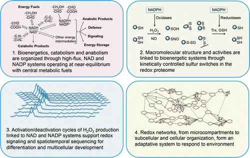 The redox code consists of four principles by which biological systems are organized (Fig. 1). The first is the use of the reversible electron accepting and donating properties of nicotinamide in NAD and NADP to provide organization of metabolism, operating at near equilibrium. Substrate oxidations are linked to reduction of NAD+ and NADP+, which in turn are linked to ATP production, catabolism, and anabolism, respectively. The second principle is that metabolism is linked to protein structure through kinetically controlled redox switches in the proteome, which determine tertiary structure, macromolecular interactions and trafficking, activity, and function. The abundance of proteins and reactivity of sulfur switches with oxidants vary over several orders of magnitude to determine specificity in biological processes. The third principle is that of redox sensing, in that activation/deactivation cycles of redox metabolism, especially involving H2O2, support spatiotemporal sequencing in differentiation and life cycles of cells and organisms. The fourth principle is that redox networks form an adaptive system to respond to the environment from microcompartments through subcellular systems to the levels of cell and tissue organization. This adaptive redox network structure is required to maintain health in a changing environment and, if functionally impaired, contributes to disease and organism failure.