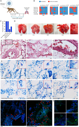 Widespread activation of MCs coinciding with lung pathology in NHPs. (A) Cynomolgus macaques were infected intratracheally with SARS-CoV-2 and monitored for 21 days prior to necropsy. (B) Viral detection was determined by PCR at regular intervals post-infection in swabs from multiple mucosal tissues, lung lavage, and nasal rinses. All NHPs were positive for SARS-CoV-2 infection multiple days after inoculation. (C) Abnormal findings related to lung tissue observed at the time of necropsy were recorded and effected all animals. (D) Images of NHP lungs at the time of necropsy show areas of hemorrhaging and necrotic spots on the lung surface. Boxed region is enlarged. (E) Histological assessment of lung tissues by H&E staining shows hemorrhaging of the tissue and free RBCs within the lung alveolar spaces. (F) Inset corresponding to the boxed region of panel H. (G) Some RBCs in the tissue proximal to a blood vessel are indicated by arrows and cellular infiltrates are circled. (H) Multiple examples of degranulating or hypogranulated MCs are provided, observed in toluidine blue stained lung tissue sections. The MCs are enlarged in the red-outlined insets. For (I-K), lung sections were stained for MC heparin to indicate the location of MC granules (green) and DAPI to identify cellular nuclei and tissue structures. MCs are indicated with red arrows. (I) MCs were observed degranulating in the lung of SARS-CoV-2 infected primates in sections of a biopsy of lung tissue that did not have overt hemorrhaging visible on the lung surface at necropsy. (J) MCs appear more densely packed in the lung biopsy from a hemorrhagic lobe of the lung and again, degranulation is observed based on staining for MC-heparin. (K) Images of degranulating MCs are presented at higher magnification.