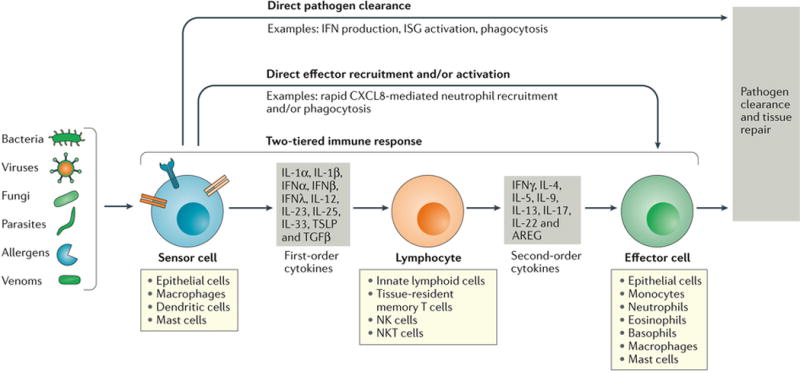 A stepwise engagement of tiered responses following respiratory infection Pathogens and certain noxious compounds are detected by sensor cells located within the respiratory tract. Sensor cells immediately initiate innate immune responses that may be sufficient to clear localized infections. For example, sensor cells may secrete factors such as interferons (IFNs) that lead to pathogen clearance (direct pathogen clearance, top arrow). In some cases, first order cytokines directly recruit effector cells that clear pathogens; for example, CXCL8 mediate recruitment of neutrophils to clear bacteria (direct effector recruitment and/or activation, second arrow from the top). In addition, a two-tiered response can be engaged, in which sensor cells secrete first order cytokines that act on tissue-resident lymphoid cell populations, which integrate these signals and release appropriate second order cytokines. These cytokines in turn recruit and activate effector cells and effector functions specific to the pathogen type, which serve to promote pathogen clearance and tissue repair. |