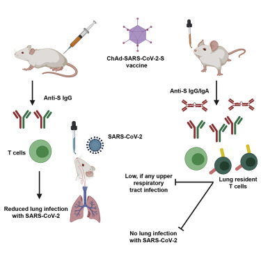 The coronavirus disease 2019 pandemic has made deployment of an effective vaccine a global health priority. We evaluated the protective activity of a chimpanzee adenovirus-vectored vaccine encoding a prefusion stabilized spike protein (ChAd-SARS-CoV-2-S) in challenge studies with severe acute respiratory syndrome coronavirus 2 (SARS-CoV-2) and mice expressing the human angiotensin-converting enzyme 2 receptor. Intramuscular dosing of ChAd-SARS-CoV-2-S induces robust systemic humoral and cell-mediated immune responses and protects against lung infection, inflammation, and pathology but does not confer sterilizing immunity, as evidenced by detection of viral RNA and induction of anti-nucleoprotein antibodies after SARS-CoV-2 challenge. In contrast, a single intranasal dose of ChAd-SARS-CoV-2-S induces high levels of neutralizing antibodies, promotes systemic and mucosal immunoglobulin A (IgA) and T cell responses, and almost entirely prevents SARS-CoV-2 infection in both the upper and lower respiratory tracts. Intranasal administration of ChAd-SARS-CoV-2-S is a candidate for preventing SARS-CoV-2 infection and transmission and curtailing pandemic spread.