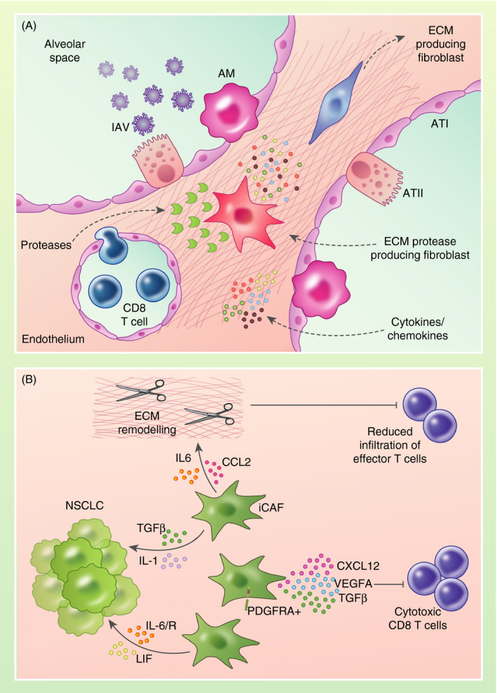 Fibroblast modification of the ECM regulates T‐cell entry into the lung in IAV infection and cancer. (A) Following IAV infection, ECM modified by fibroblast activity integrates innate immune signals to regulate the adaptive immune environment of the lung. Fibroblasts produce inflammatory chemokines and cytokines that drive ATII proliferation, for example interleukin‐1 beta (IL‐1β) and tumour necrosis factor‐alpha (TNF‐α). ECM protease‐producing fibroblasts degrade the ECM allowing T cells to migrate from the vasculature into the lung tissue to combat infection. Components are labelled with dotted line arrows. (B) Cancer‐associated fibroblasts (CAFs) also modify the ECM and regulate T‐cell entry into the tumour microenvironment. Inflammatory CAF (iCAF) subtypes secrete numerous chemokines and cytokines (indicated by curly arrows), such as transforming growth factor‐β (TGF‐β), interleukin‐6 (IL‐6), interleukin‐1 (IL‐1) and lymphocyte inhibitory factor (LIF) that promote the growth and proliferation of tumour cells. Other soluble factors released by iCAFs such as C‐X motif chemokine ligand 12 (CXCL12) and vascular endothelial growth factor A (VEGFA) inhibit (blunted arrow) the antitumour immune response via suppression of cytotoxic CD8 T cells. Finally, CAFs can synthesize ECM components (MMPs and collagens), and modification of the ECM by IL‐6 and C‐C motif chemokine ligand 2 (CCL2) contributes to increased ECM stiffness, which in turn reduces (blunted arrow) the infiltration of effector T cells to the tumour site. NSCLC, non‐small‐cell lung cancer. |