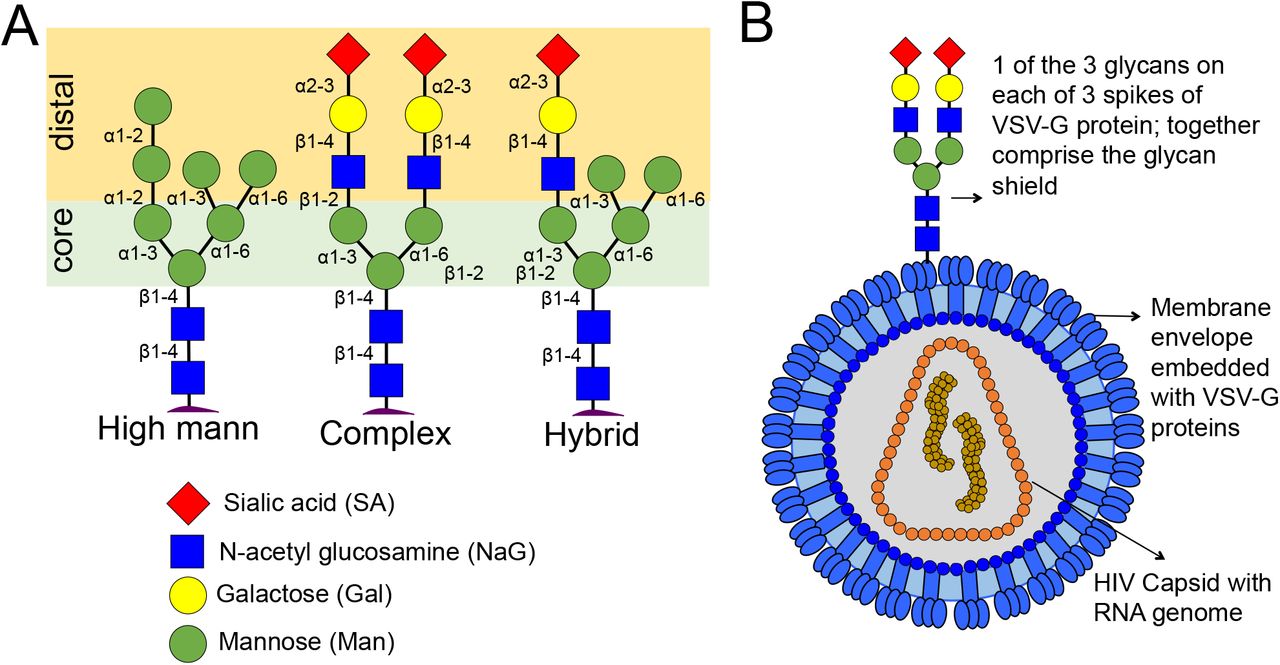 Types of N-glycans protruding from proteins in cell membranes. [B] Presentation of complex N-glycans within the glycan shields of HIV-1 virus pseudotyped with VSV-G proteins. |